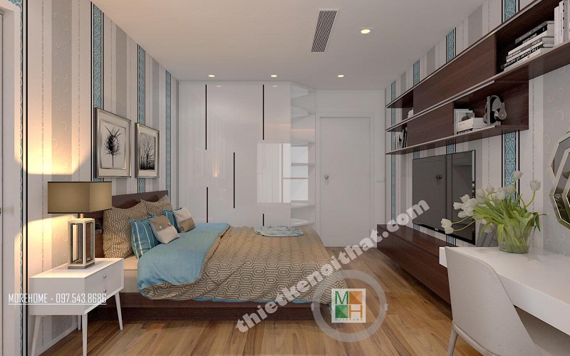 Đây cũng là không gian riêng tư nhất của mỗi thành viên trong gia đình, vì vậy càng đặc biệt bố trí thiết kế theo sở thích, mong muốn của mỗi người. Phòng ngủ chung cư Vinhomes được thiết kế thông minh giúp không khí trong phòng lưu thông với bên ngoài, đón ánh nắng và gió trời. Không gian phòng nghỉ hoàn toàn thoải mái và thư giãn chắc chắn sẽ giúp bạn có những phút giây thư giãn tuyệt vời nhất. Tại phòng ngủ của căn chung cư được bố trí tủ quần áo âm tường với thiết kế hiện đại, tăng công năng sử dụng tiện ích lại giúp không gian phòng ngủ thêm rộng rãi. Bạn cũng có thể lựa chọn thiết kế kệ tivi kế vách ngăn của phòng ngủ tạo không gian mở, thiết kế này giúp phòng ngủ của bạn thoáng hơn, tránh cảm giác chật trội, bó buộc. Về phần trang trí phòng ngủ thì tường phía đầu giường có thể dán giấy hoa văn, đem đến giác ấn tượng mềm mại cho phòng ngủ, xen kẽ vào đó là bức tranh treo tường trắng đen đơn giản. Hoặc bạn cũng có thể lựa chọn treo một bức tranh trang trí có màu sắc nổi bật làm điểm nhấn cho phòng ngủ tại phần tường đầu giường này.