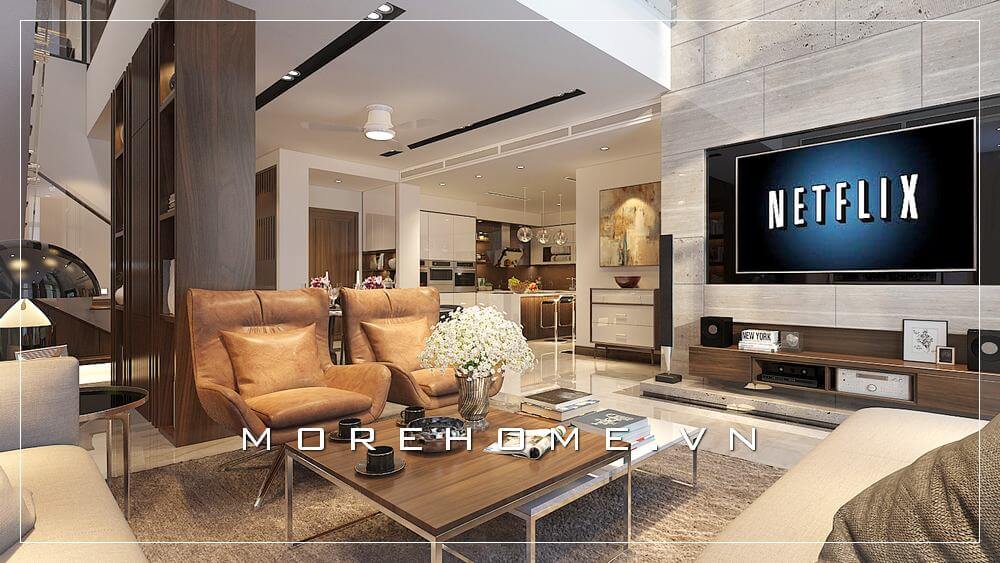 Với bộ sofa tone nâu sang trọng và vỏ bọc da cao cấp được thiết kế theo lối hiện đại kết hợp chân sắt thanh thoát mang đến cho không gian phòng khách biệt thự sự thoải mái, tiện nghi mà sang trọng tinh tế