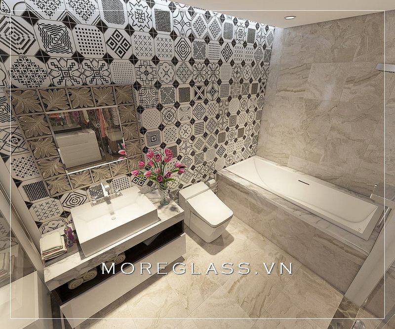 Mẫu thiết kế phòng tắm hiện đại với nội thất tối giản, tiện nghi, sử dụng gạch ốp tường và gạch lát nền màu trắng vân may cao cấp cuốn hút mọi ánh nhìn