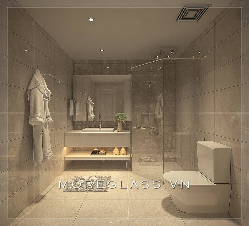 Thiết kế phòng tắm rộng hiện đại với kính cường lực và gạch lát nền mang đến sự sạch sẽ và thoáng mát