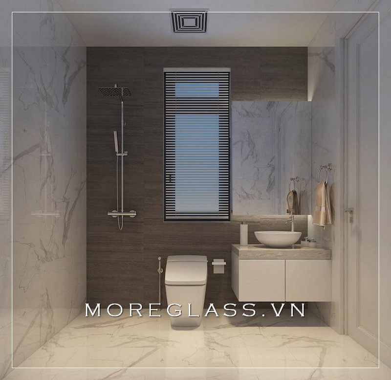 Bố trí nội thất phòng tắm hiện đại, phần cửa sổ được thiết kế với kích thước lớn, kết hợp vách kính cường lực an toàn mang đến cho không gian phòng ngủ thêm phần rộng thoáng hơn cả