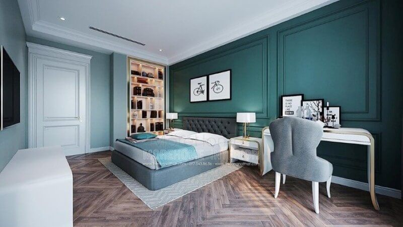 Thiết kế nội thất phòng ngủ master tân cổ điển sử dụng tone trắng chủ đạo sẽ là lựa chọn ấn tượng cho chủ nhà mệnh Kim.